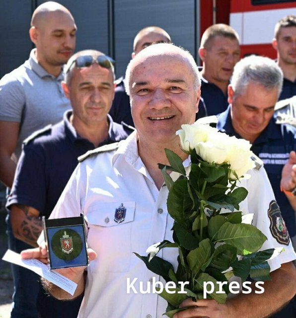 Комисар Светослав Георгиев – директор на РДПБЗН, му връчи отличието от министъра на вътрешните работи ПОЧЕТЕН ЗНАК НА МВР – II степен, и се обърна към него с думите: